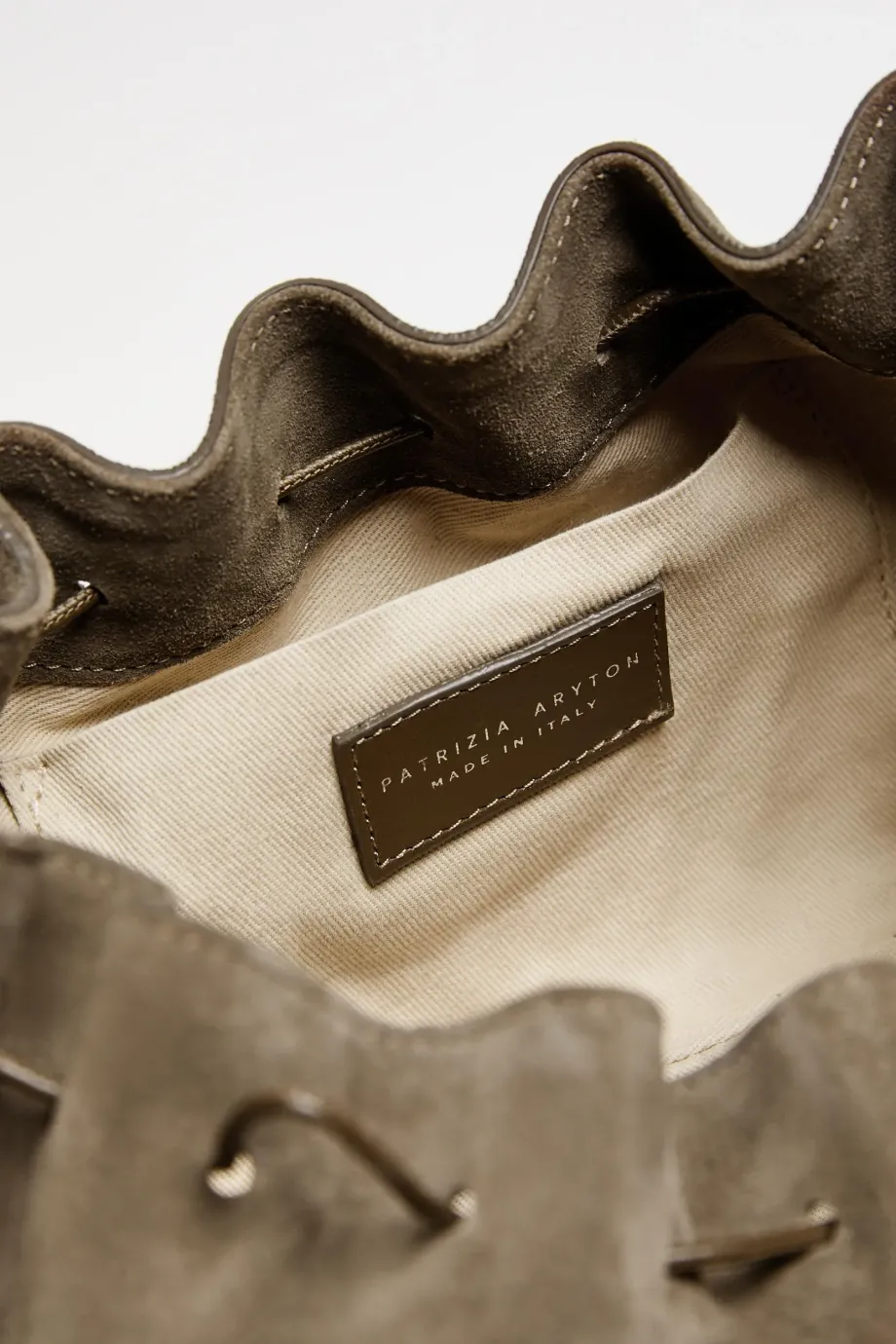 Zelená kabelka na rameno z přírodní semišové kůže. Model s půlkulatým tvarem a zapínáním ve formě řasení. Kabelka je ručně šitá v italské manufaktuře s důrazem na detaily a kvalitu zpracování. Vnitřní část je vybavena kapsou na zip a odnímatelnou semišovou taštičkou.