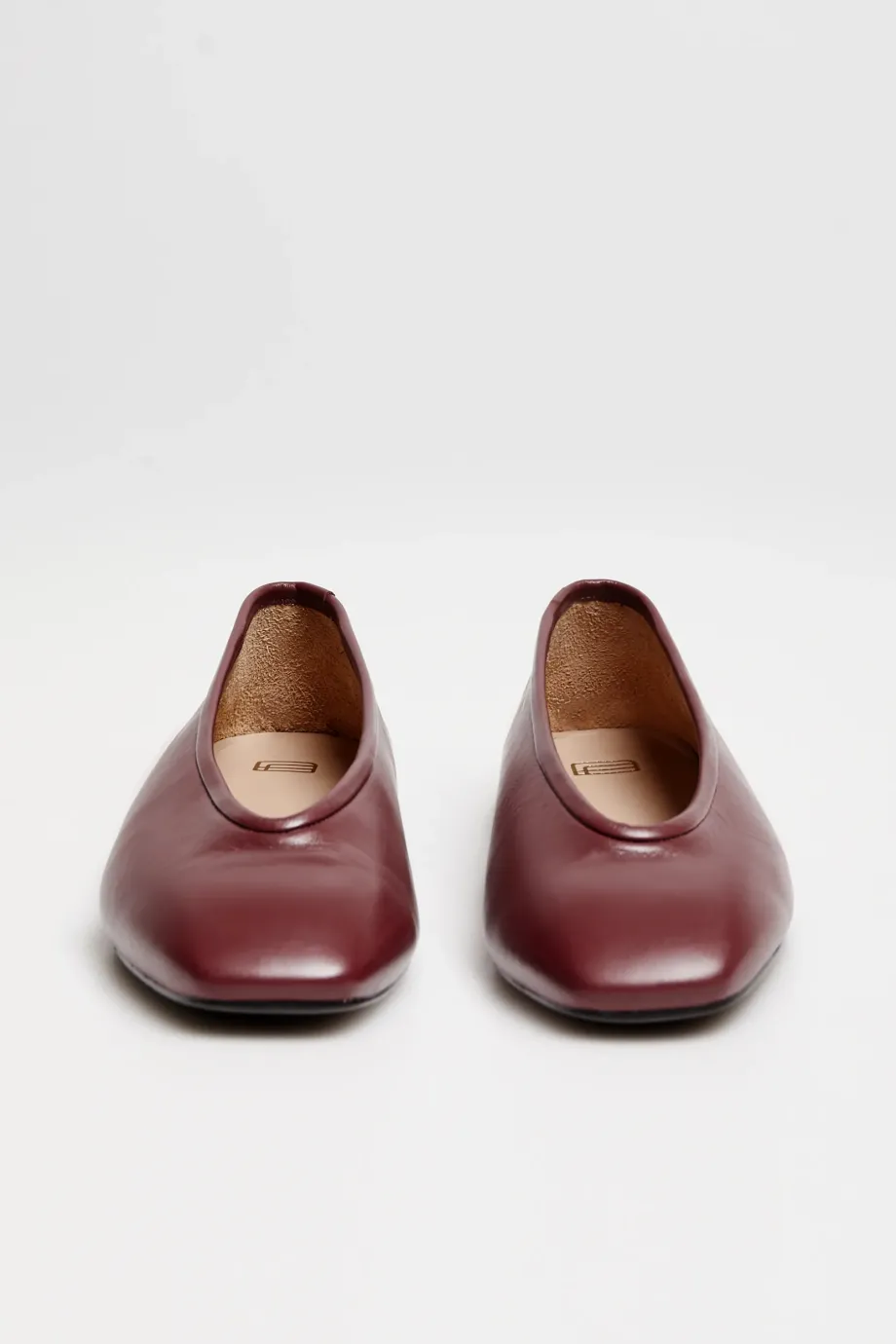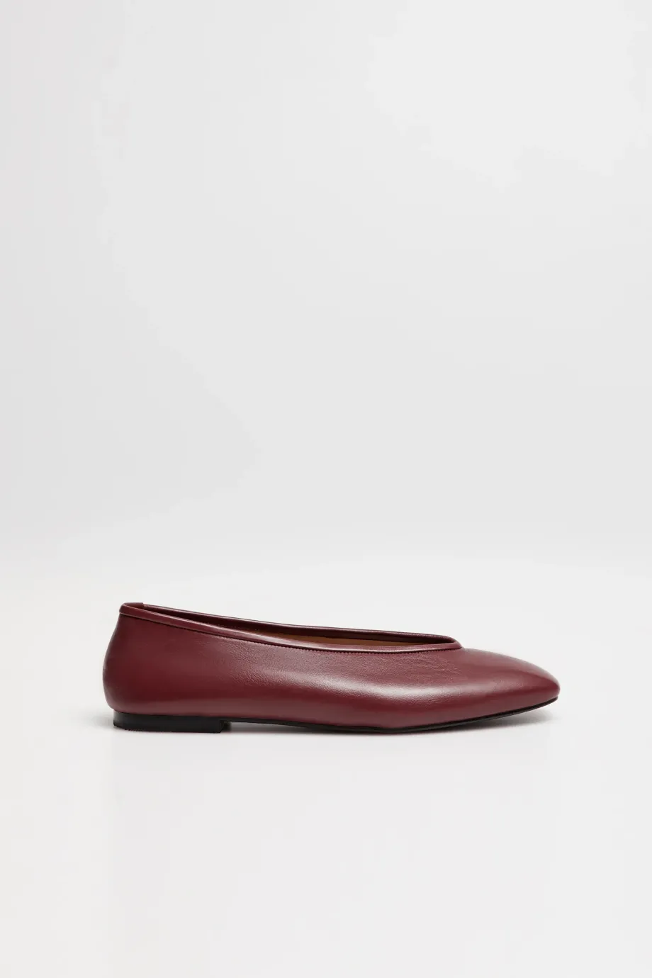 Baleríny vyrobené z přírodní jehněčí a hovězí kůže. Čtvercová špička, plochá podrážka. Červená barva. Ručně šité ve španělské manufaktuře.
