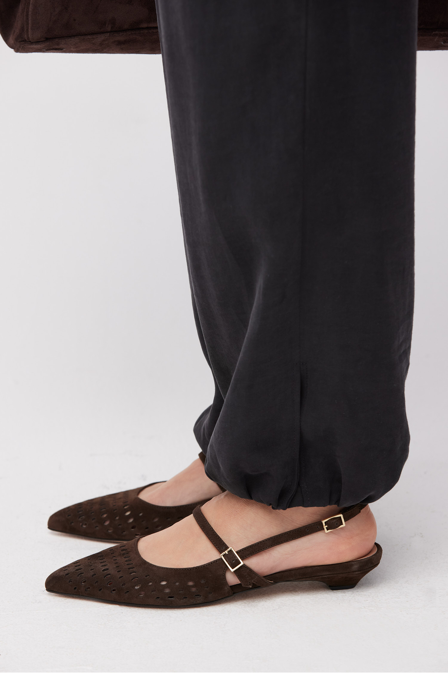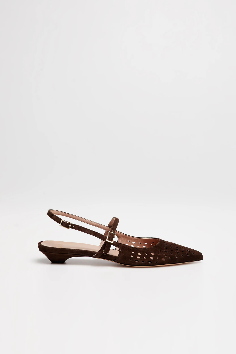 Hnědé slingback boty z přírodní kůže. Velmi měkká perforovaná kozí kůže. Nastavitelné zapínání. Nízký podpatek. Ručně vyrobené v italské manufaktuře.