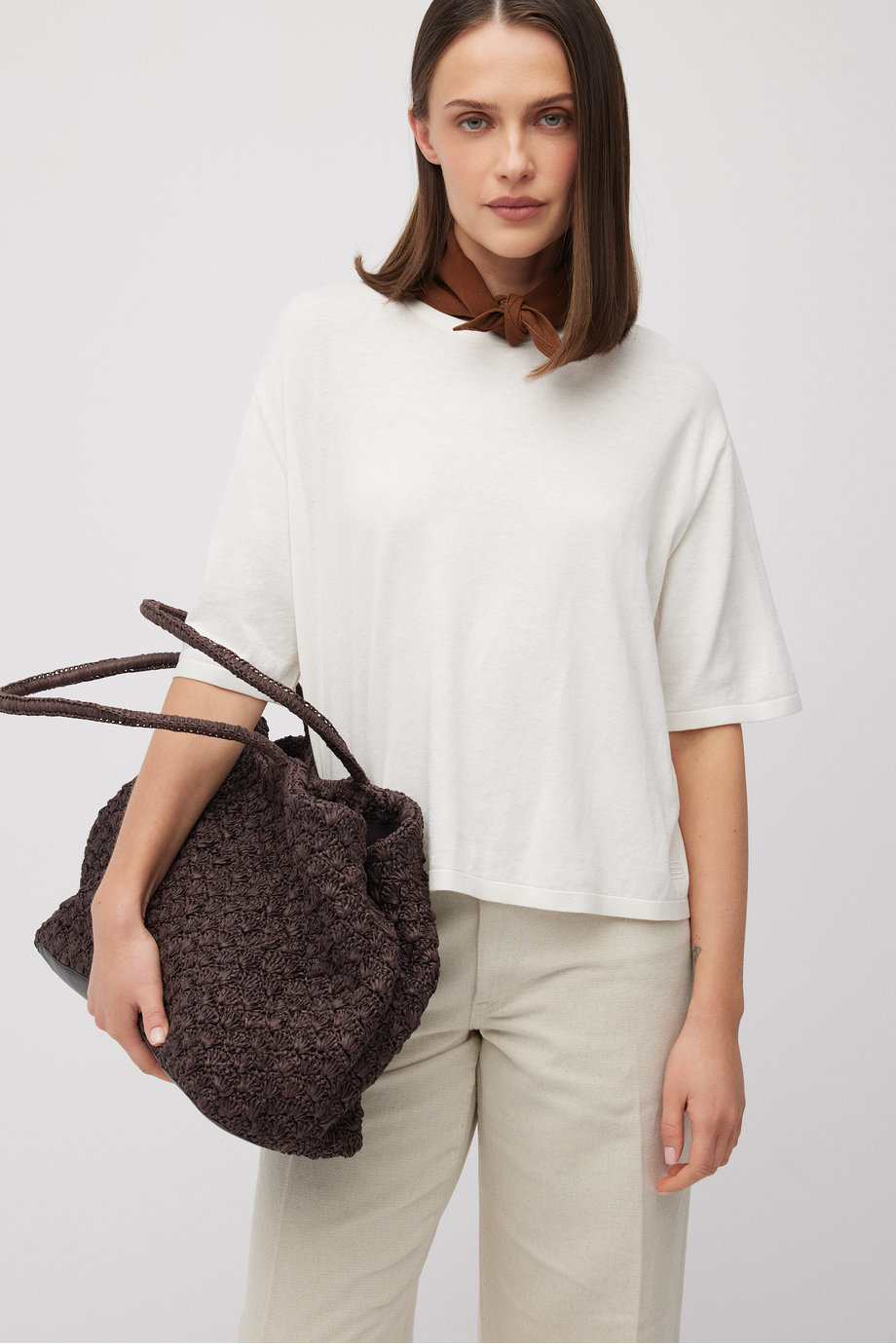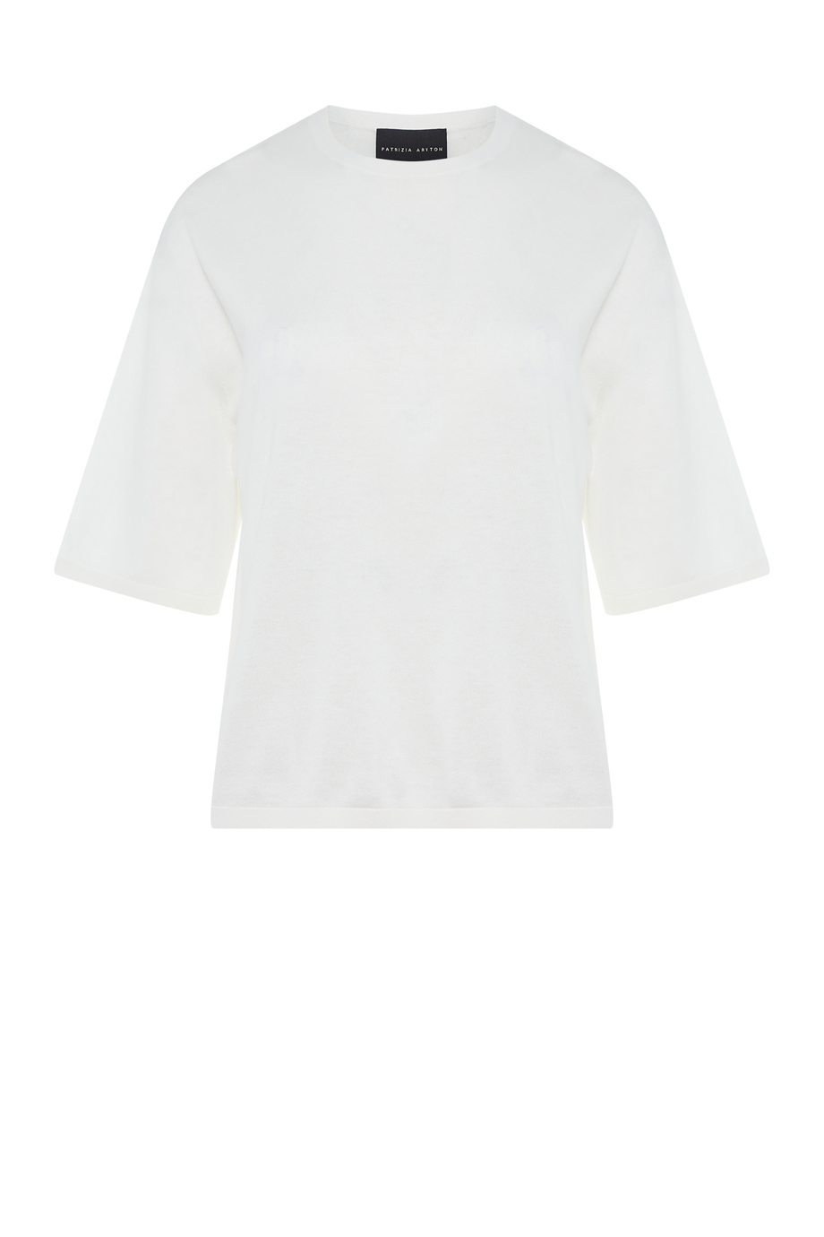 Halenka ze směsi bavlny a hedvábí. Kulatý výstřih, krátký rukáv. Volný, boxy střih. Měkký úplet s jemnou strukturou single jersey, vyrobený na stroji s jemností 18 GG. Barva: bílá.