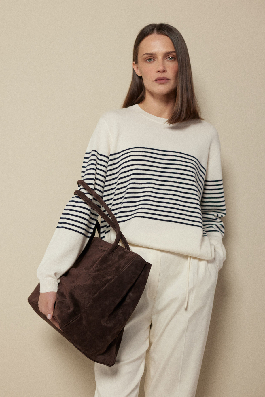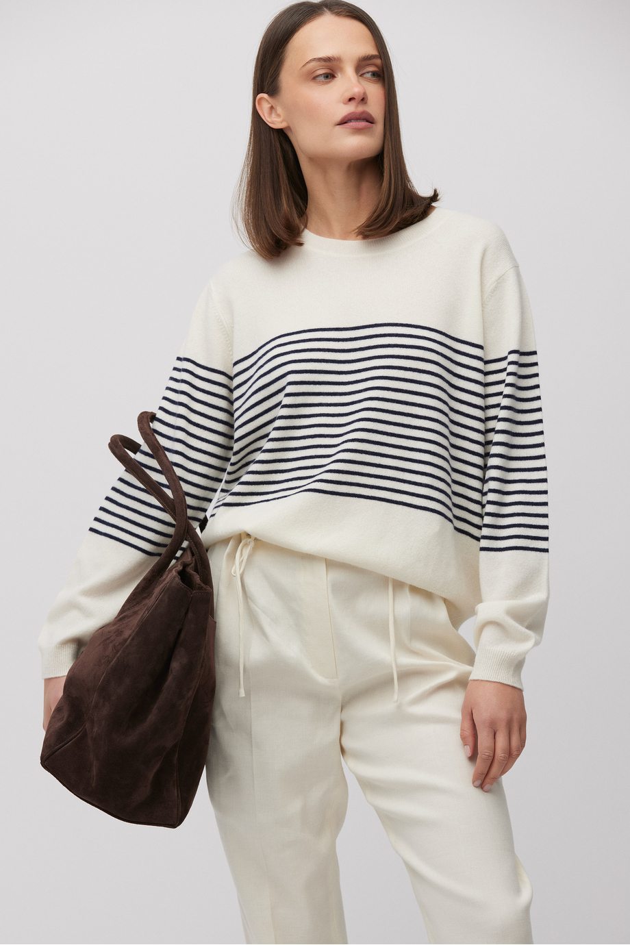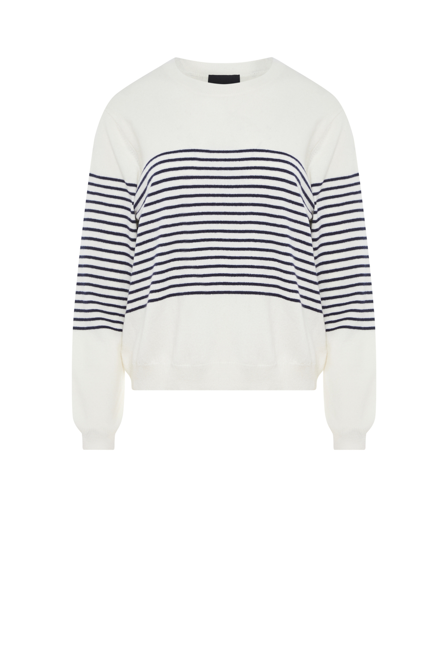 Pruhovaná halenka ze směsi merino vlny a kašmíru. Dlouhý rukáv, kulatý výstřih. Volný střih. Měkký úplet typu single jersey, vyrobený na stroji s jemností 14 GG.