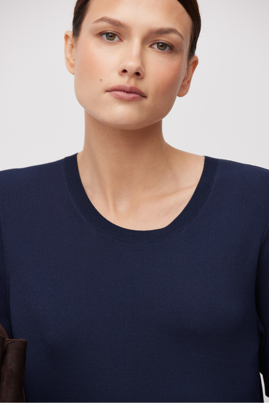 Midi šaty s krátkým rukávem. Jednoduchý střih, kulatý výstřih. Měkký, splývavý úplet. Boční rozparky.