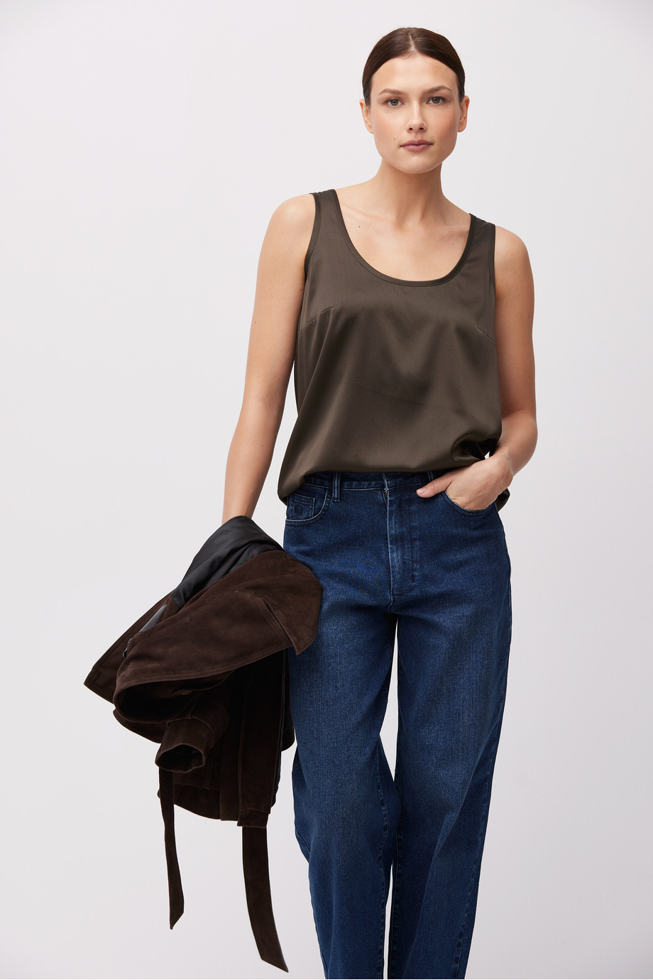 Modelka na fotografii měří 178 cm a má na sobě velikost 36.