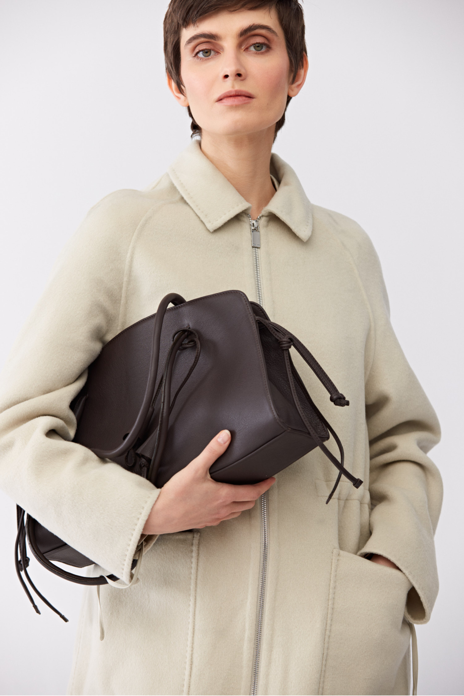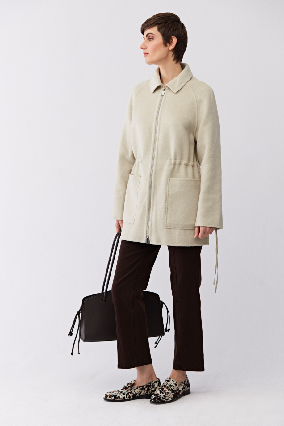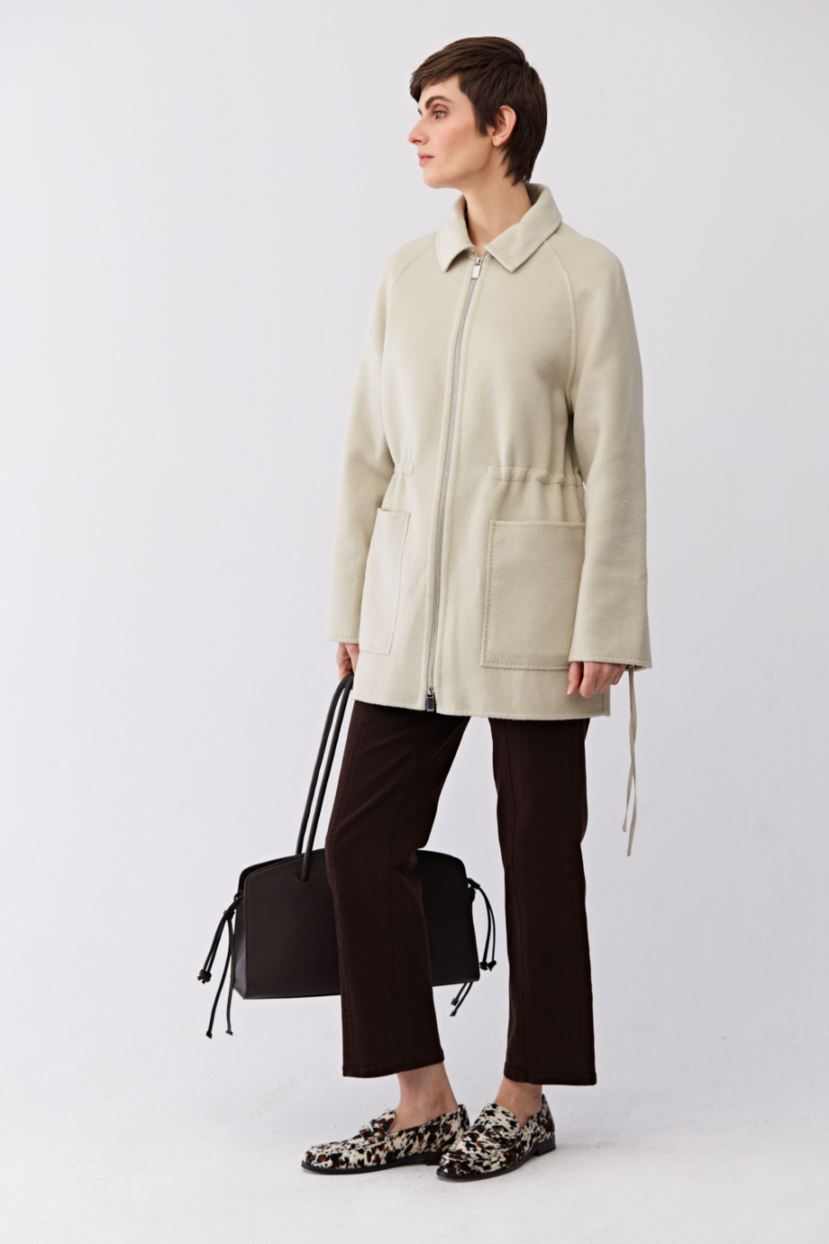 Doubleface bunda s příměsí hedvábí. Bez podšívky. Jednoduchý, volný střih. Límec, našité kapsy. Zapínání na zip. Možnost regulace v pase. Světle zelená barva.