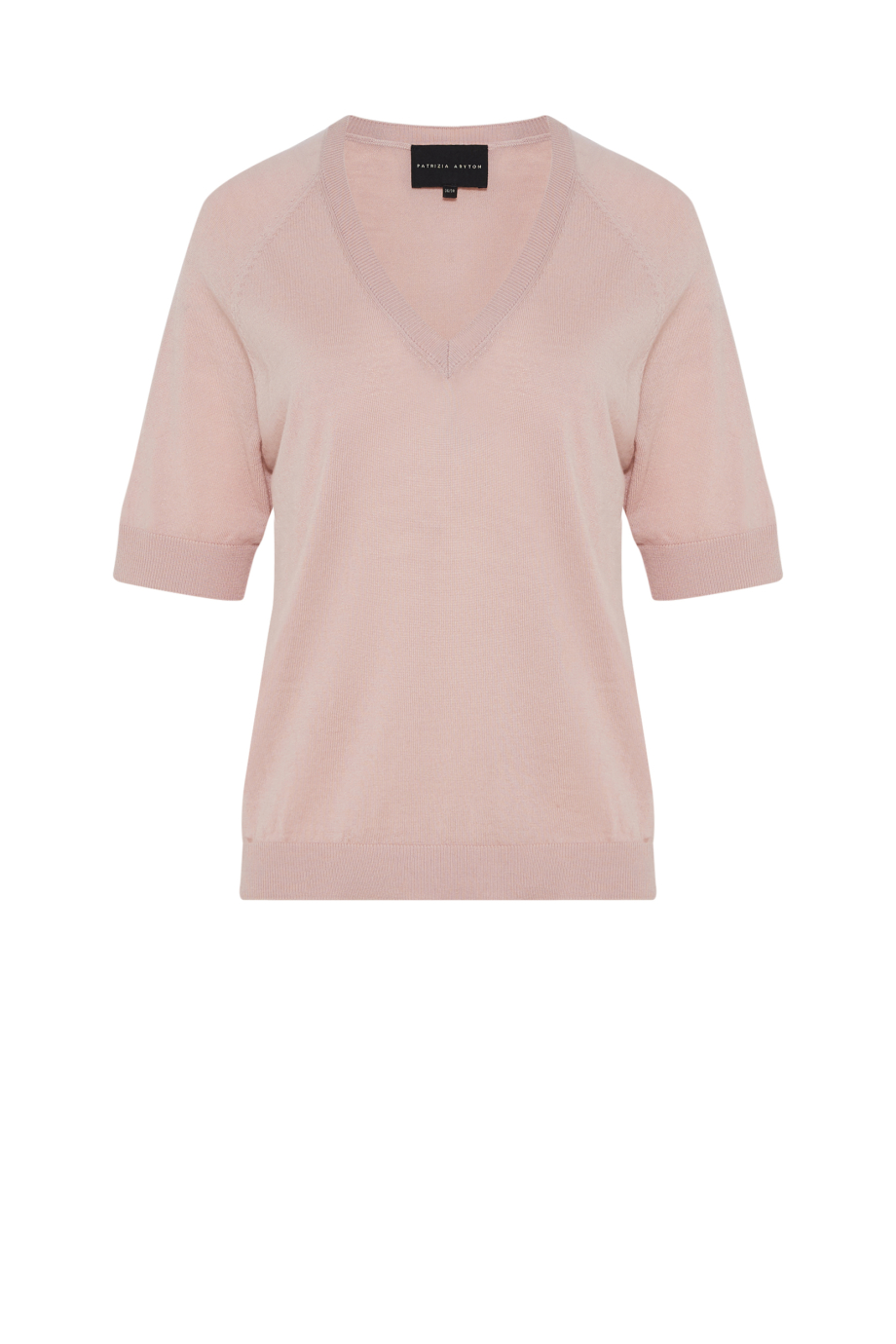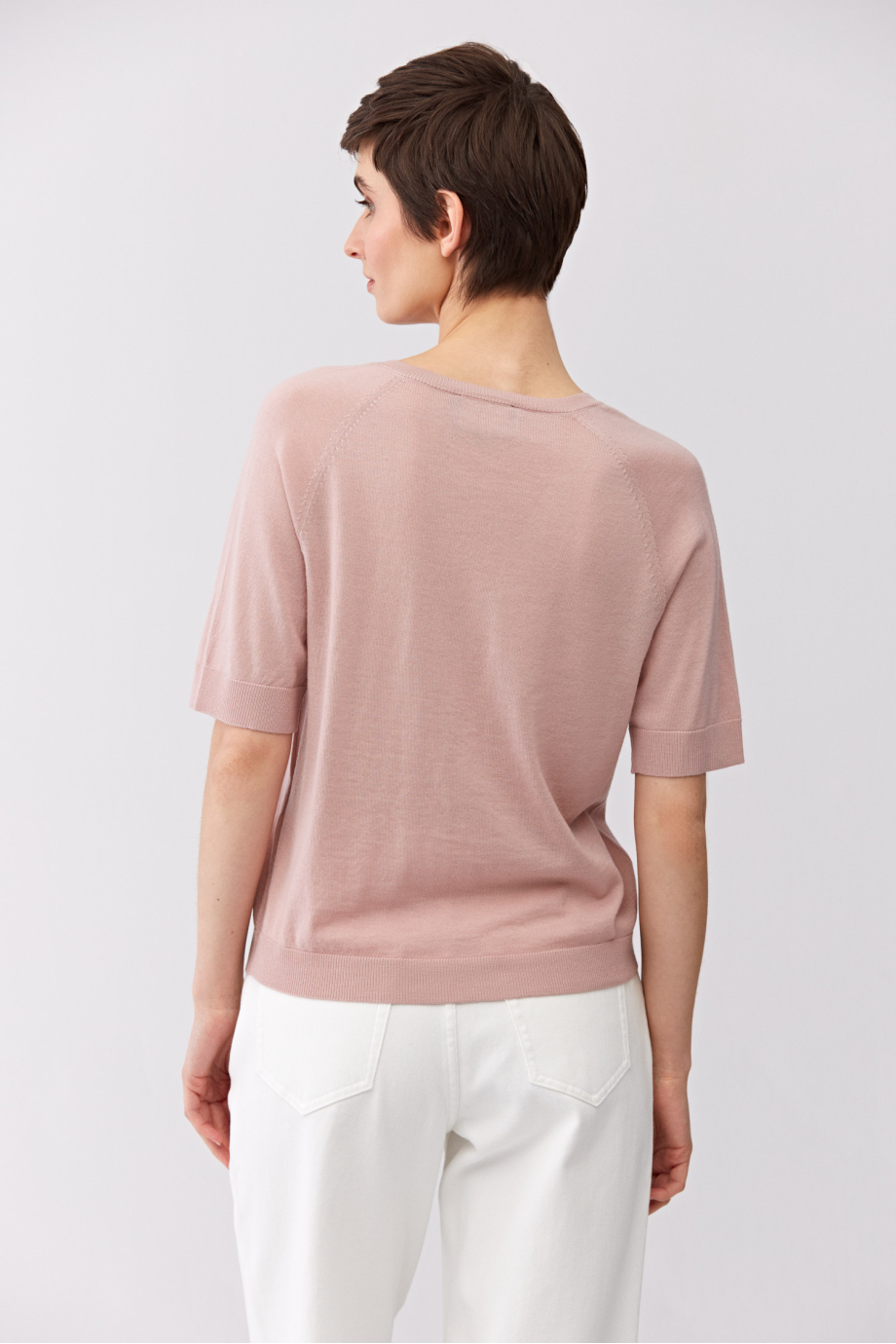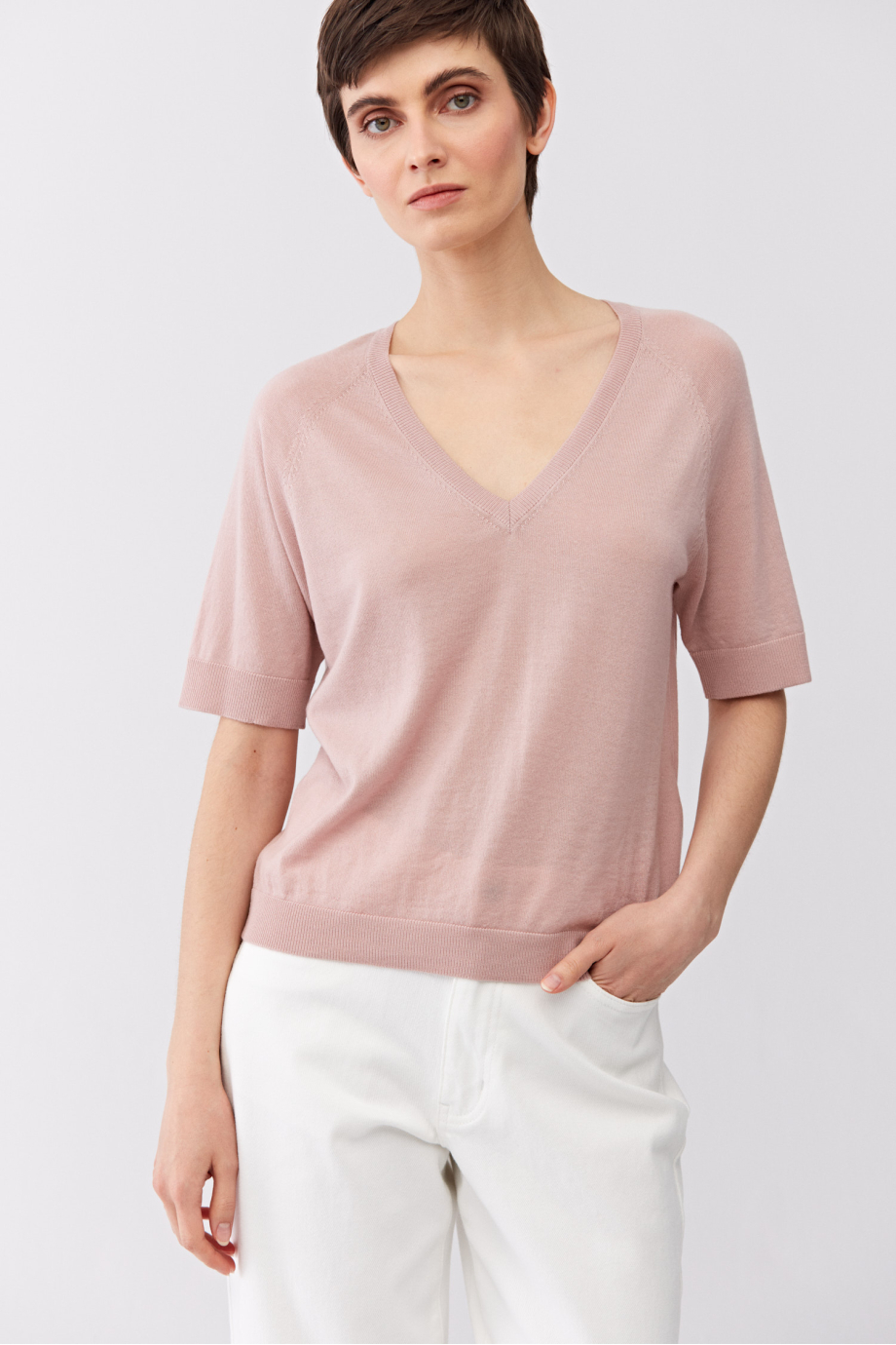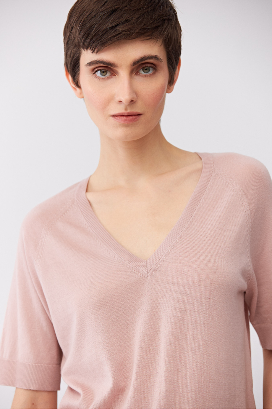 Halenka s výstřihem do V. Krátký rukáv, volný střih. Měkký úplet s jemnou vazbou single jersey, vyrobený na stroji s jemností 16 GG. Světle růžová barva.