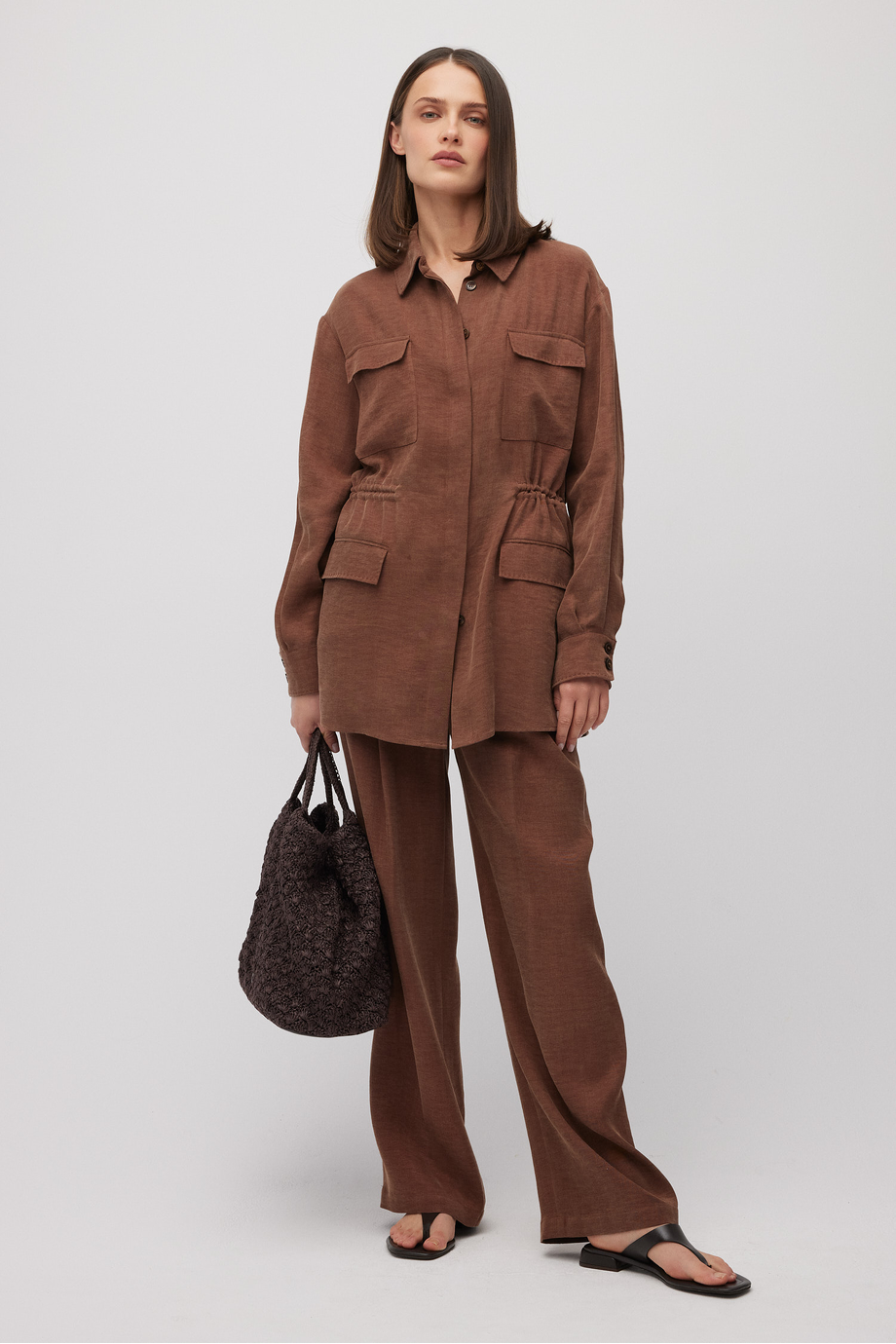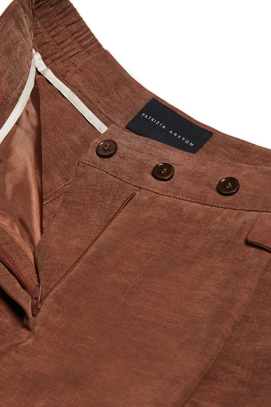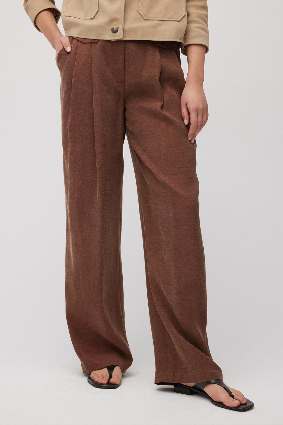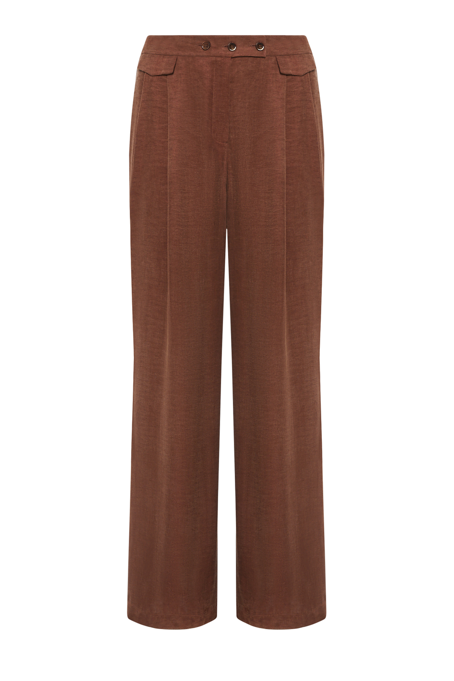 Kalhoty s vysokým pasem ze směsi lyocellu a lnu. Široká nohavice, sklady, zapínání na zip, háček a knoflík corozo zevnitř. Vnitřek s ozdobným lemováním. Kapsy. Barva: hnědá. K doplnění kompletu kabát ze stejné tkaniny.