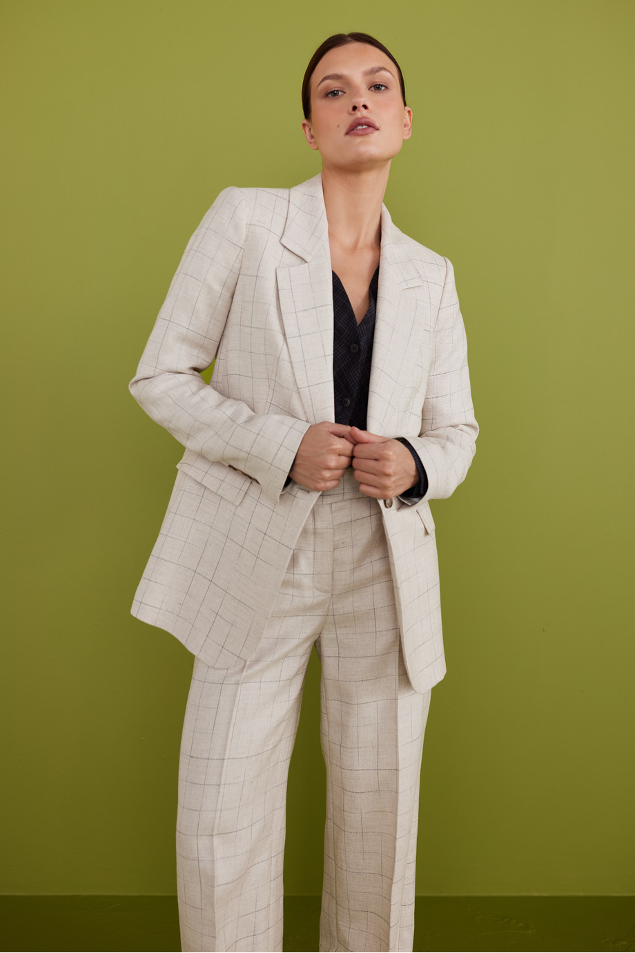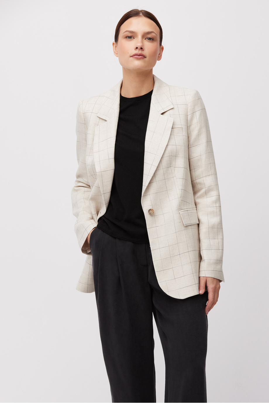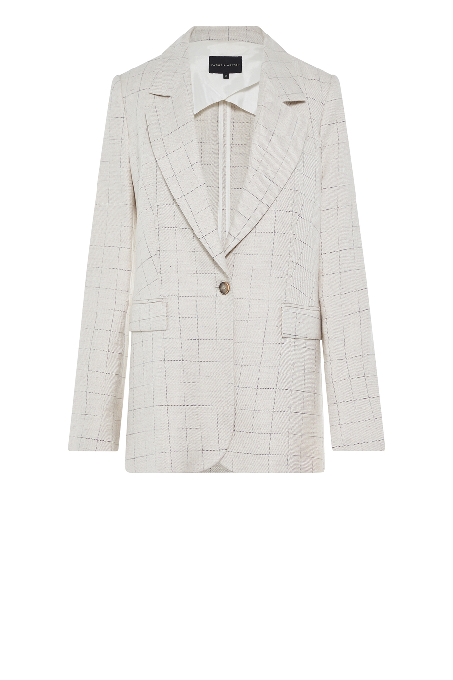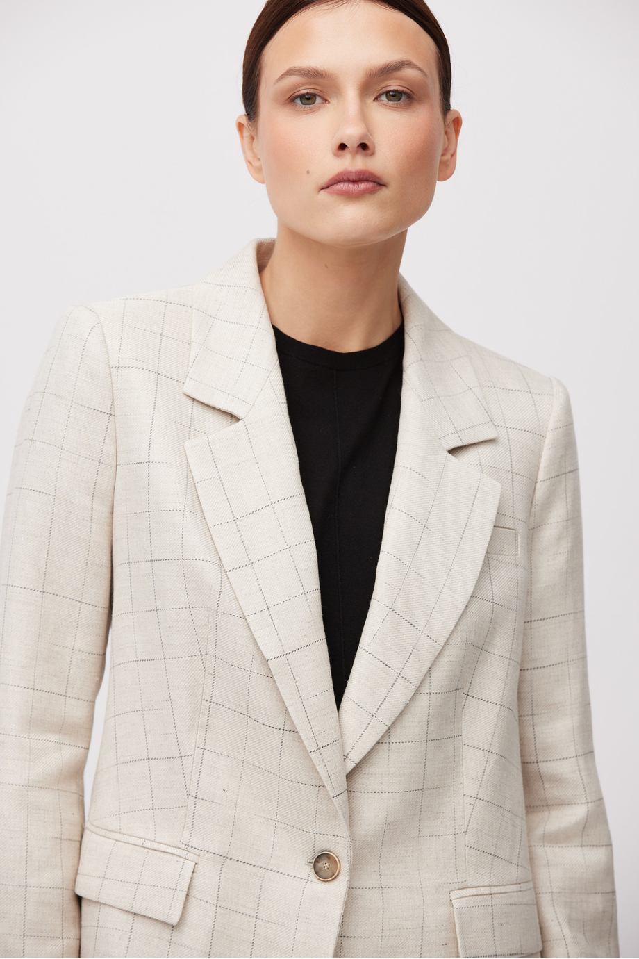 Béžové kostkované sako s příměsí lnu. Jednoduchý, volnější střih. Límec, dlouhý rukáv, zapínání na knoflík z přírodního rohu. Model s polopodšívkou a ozdobným pipingem.