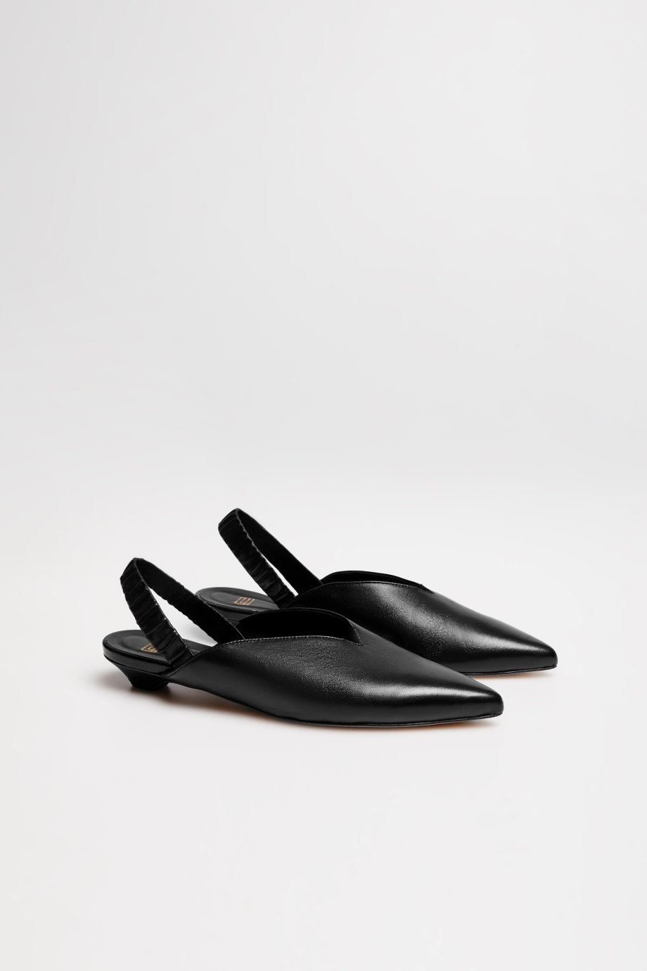 Model typu slingback na nízkém podpatku. Vyrobeny z měkké přírodní kozí a ovčí kůže v černé barvě. Charakteristická mandlová špička a elastický pásek. Ručně vyrobené v italské manufaktuře.