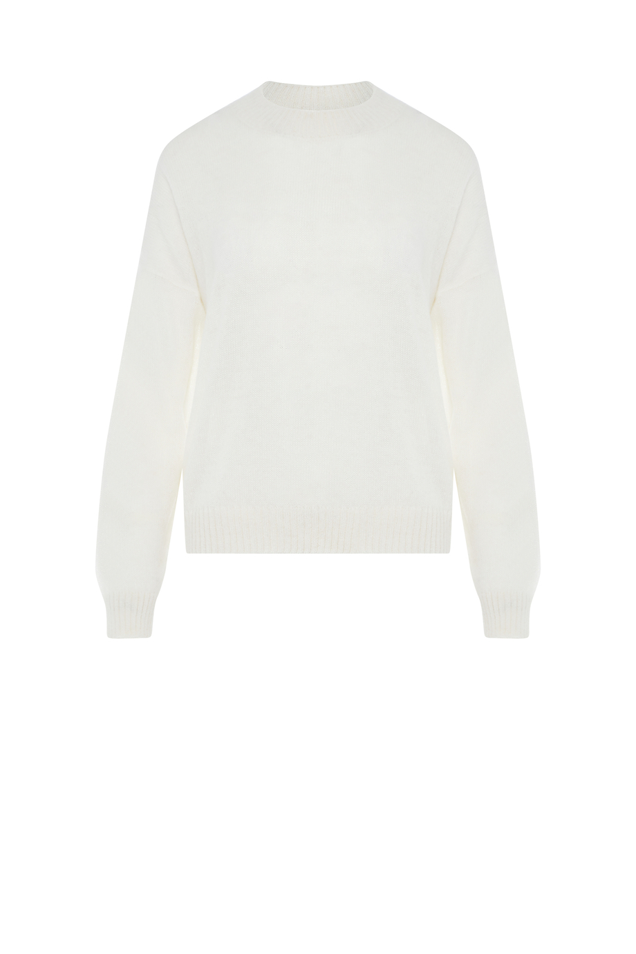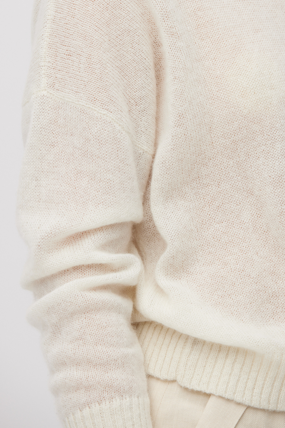 Svetr ze směsi vlny baby suri alpaka a merino vlny. Kulatý výstřih, dlouhý rukáv. Volný, boxy střih. Měkký úplet s volnou strukturou single jersey, vyrobený na stroji s jemností 7 GG. Barva: bílá.