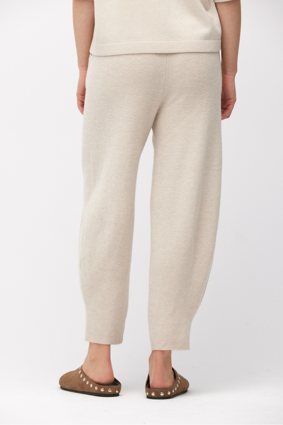 Šedé kalhoty z merino vlny. Volný střih. Kapsy. Nastavitelný pas. Měkký, příjemný úplet s hustou strukturou, vyrobený na pletacím stroji jemnosti 12 GG.