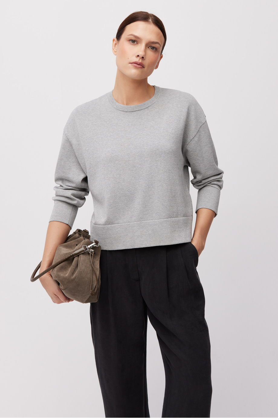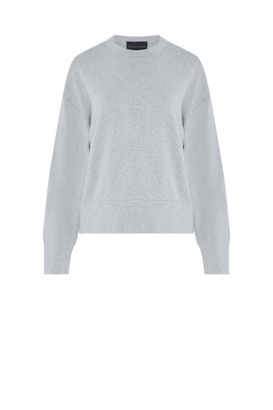 Svetr ze směsi bavlny a hedvábí. Kulatý výstřih, dlouhý rukáv. Volný střih. Měkký úplet s jemnou a hustou strukturou single jersey, vyrobený na pletacím stroji jemnosti 14 GG. Šedá barva.