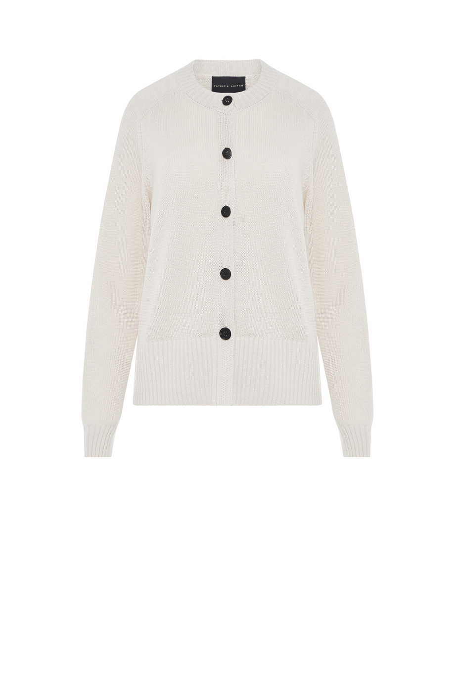 Kardigan ze lnu. Zapínání na knoflíky. Kulatý výstřih, dlouhý rukáv. Přiléhavější střih. Měkký úplet s volnější strukturou single jersey, vyrobený na pletacím stroji jemnosti 5 GG. Šedá barva.