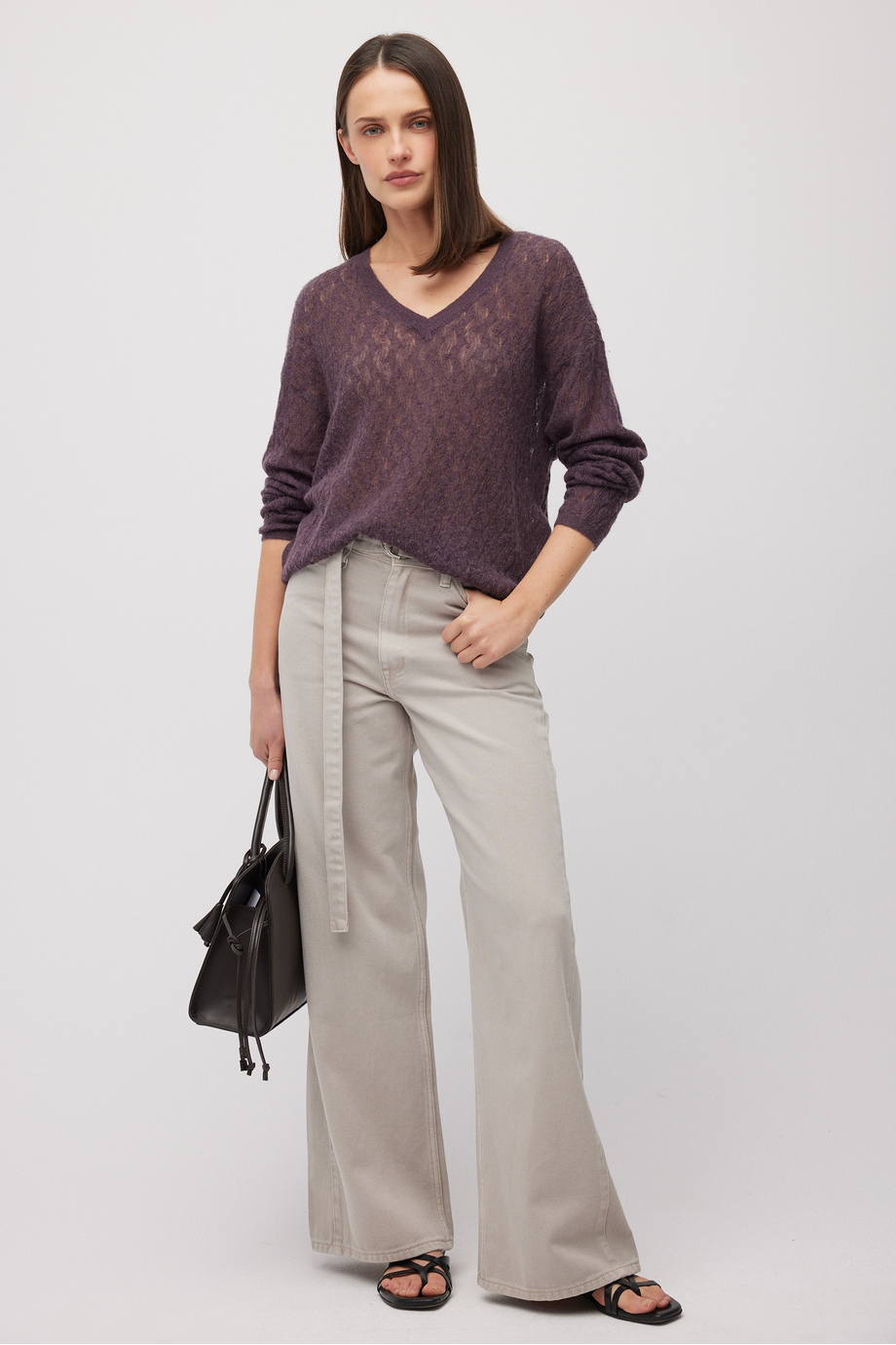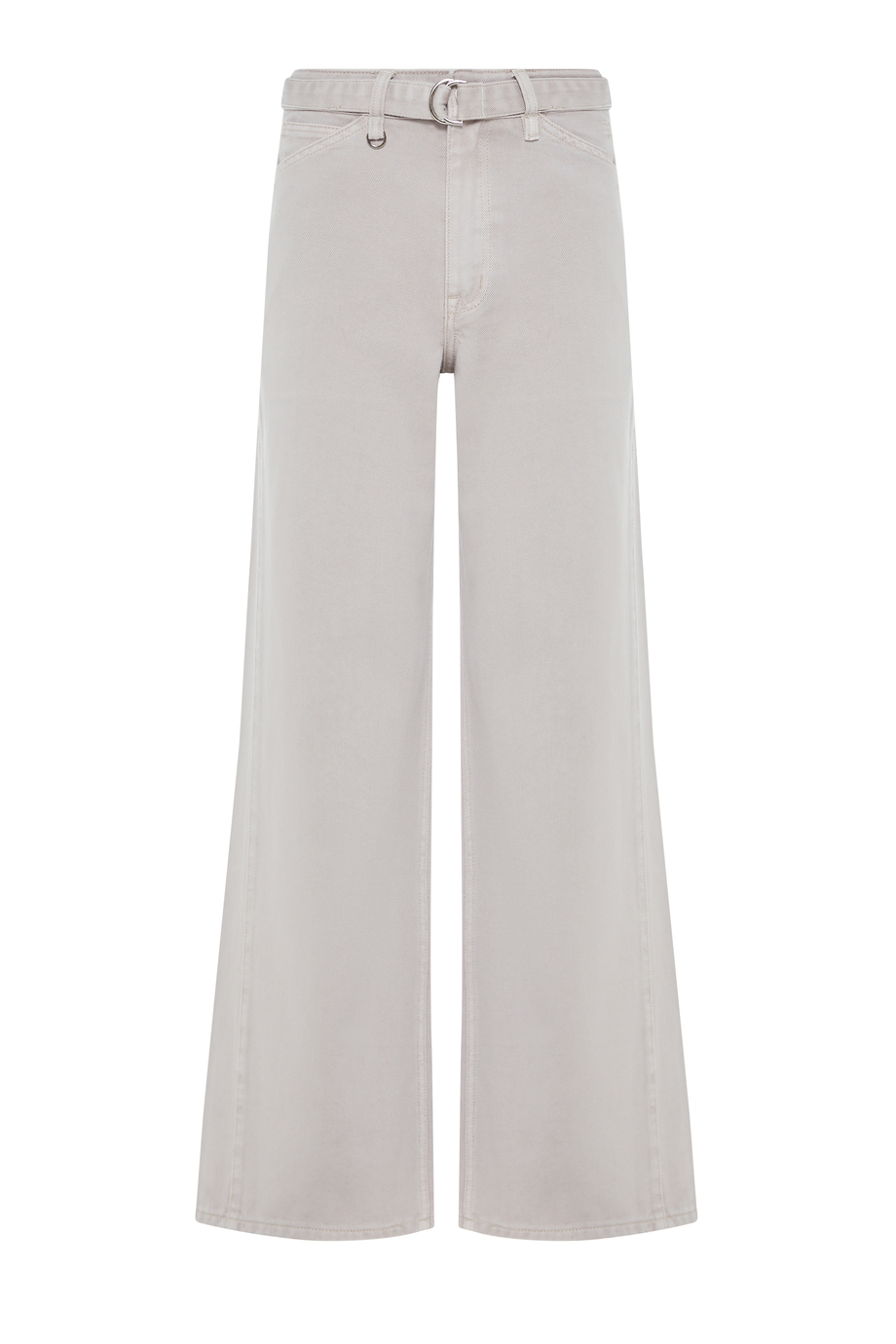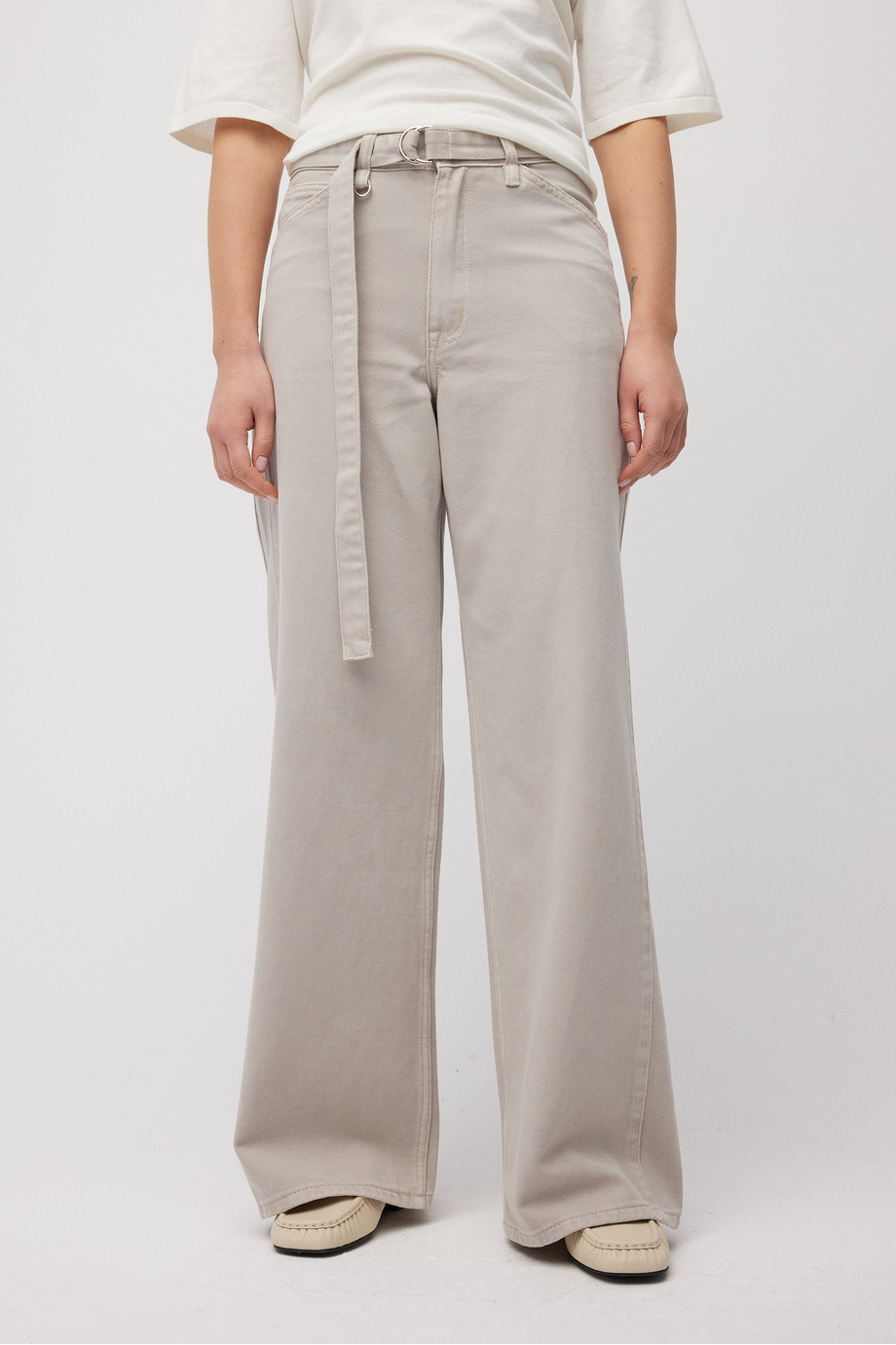 Džíny se širokou nohavicí. Zapínání na zip a knoflík. Kapsy. Vysoký pas. Vyrobeny z bavlny s příměsí lyocellu – měkké a pohodlné na nošení. Barva: šedá.