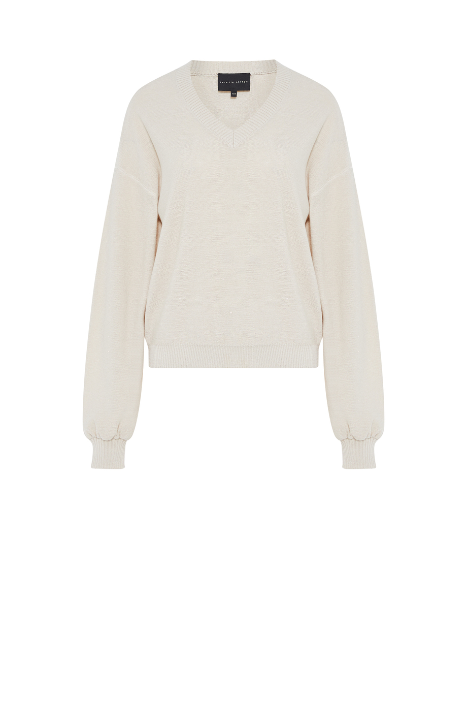 Halenka ze směsi bavlny, hedvábí a lyocellu. Dlouhý rukáv, výstřih do V. Volnější střih. Měkký úplet s jemně zapletenými flitry, vyrobený na stroji jemnosti 12 GG. Barva béžová.