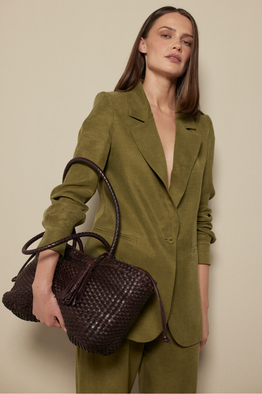 Zelené sako ze směsi lnu a lyocellu. Rovný, volný střih. Límec, dlouhý rukáv, zapínání na knoflík z přírodního ořechu. Polopodšívkový model s ozdobným paspulováním. K doplnění kompletu kalhoty ze stejné tkaniny.