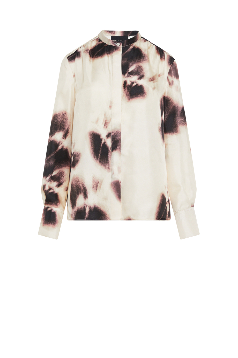 Volná hedvábná košile se vzorem. Zapínání na knoflíky ve skryté légě. Dlouhý rukáv, stojáček. Pro doplnění setu kalhoty ze stejné tkaniny.