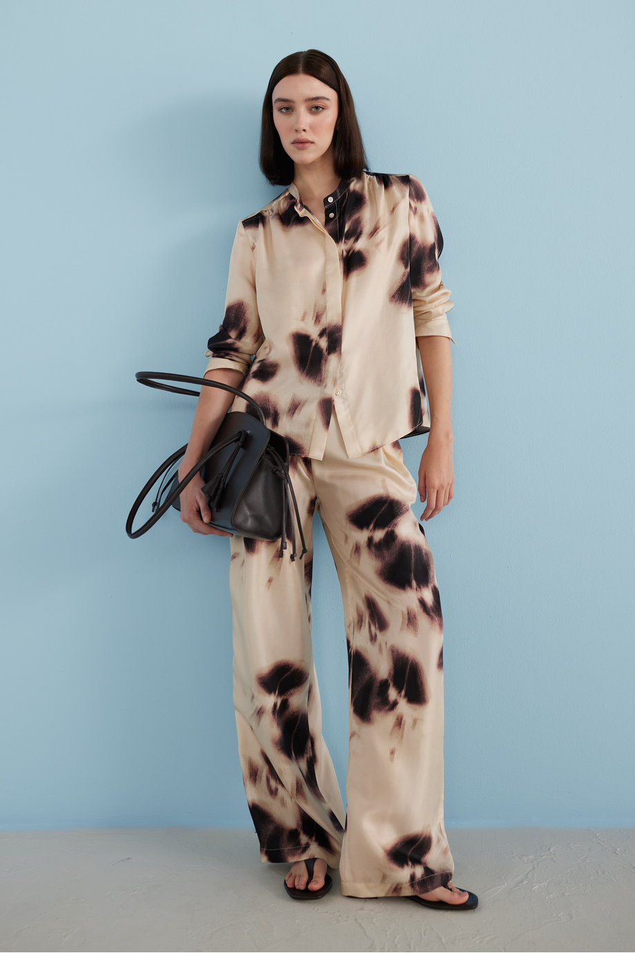 Hedvábné kalhoty s vysokým pasem. Široká nohavice. Vnitřek s ozdobným lemováním. Kapsy. Pro doplnění setu košile ze stejné tkaniny.