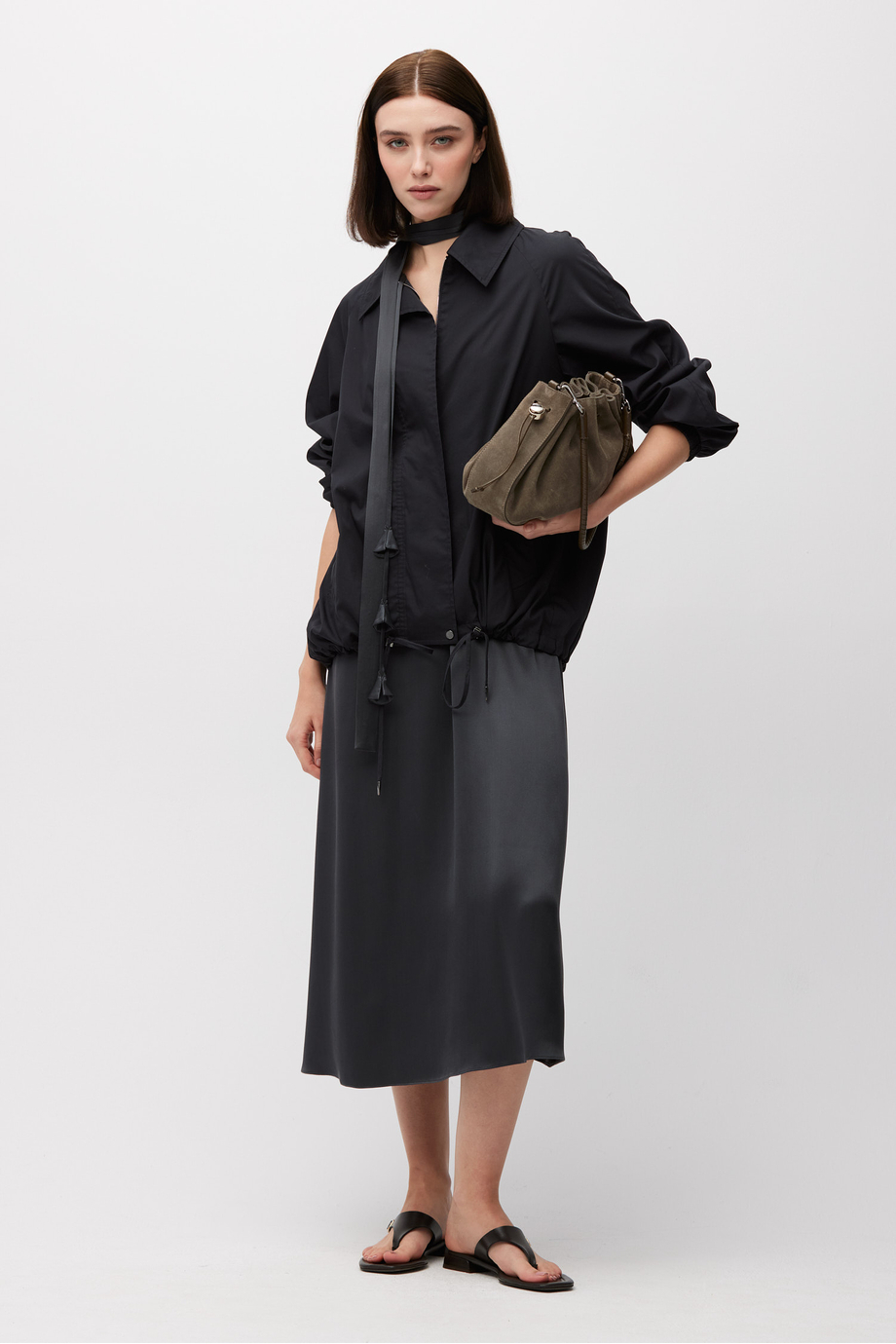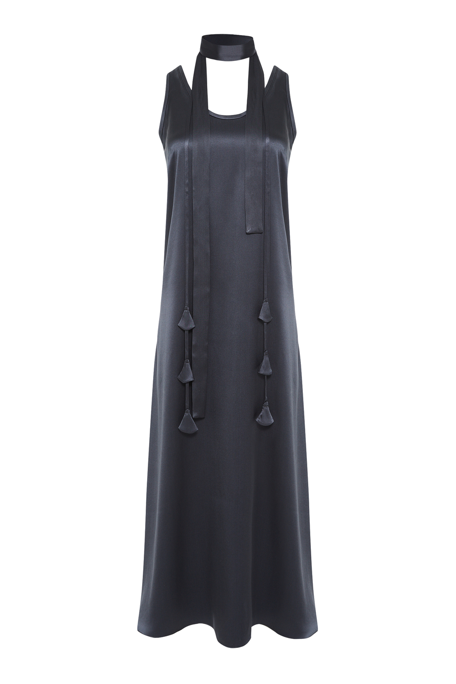Hedvábné šaty s třásněmi z pevného, splývavého hedvábí. Midi délka. Mírně rozšířený střih do A. Pásek s třásněmi pro zavázání v pase.