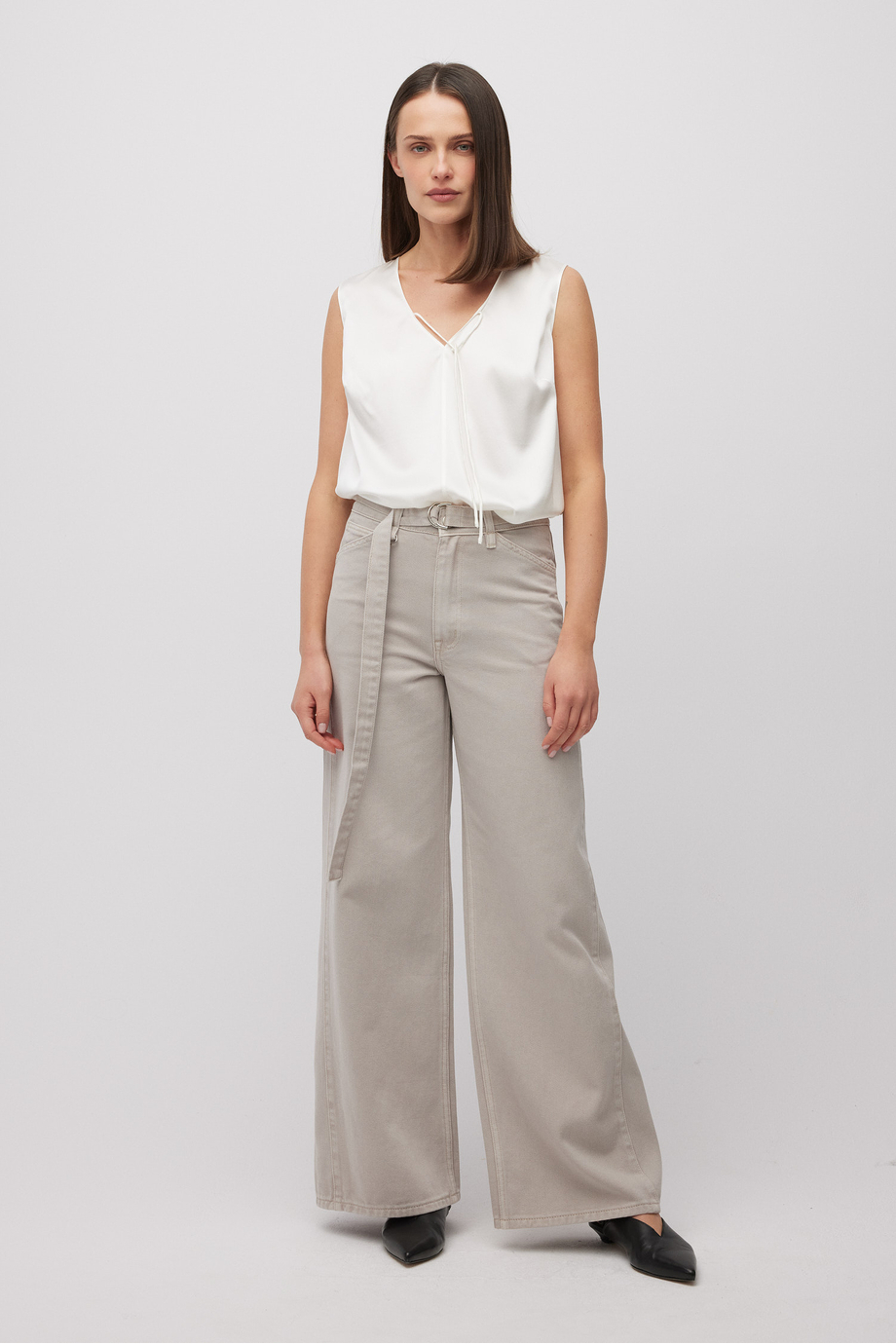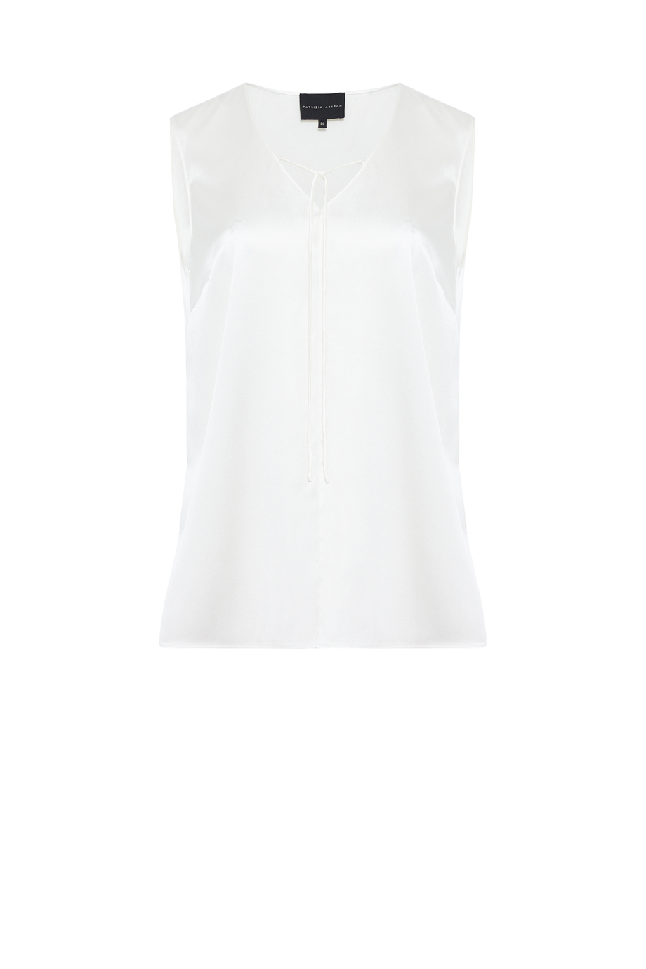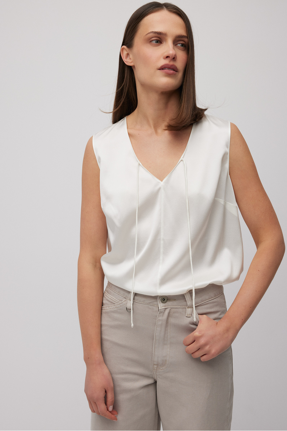 Bílý top z hedvábí. Volný střih. Výstřih do V se zavazováním.