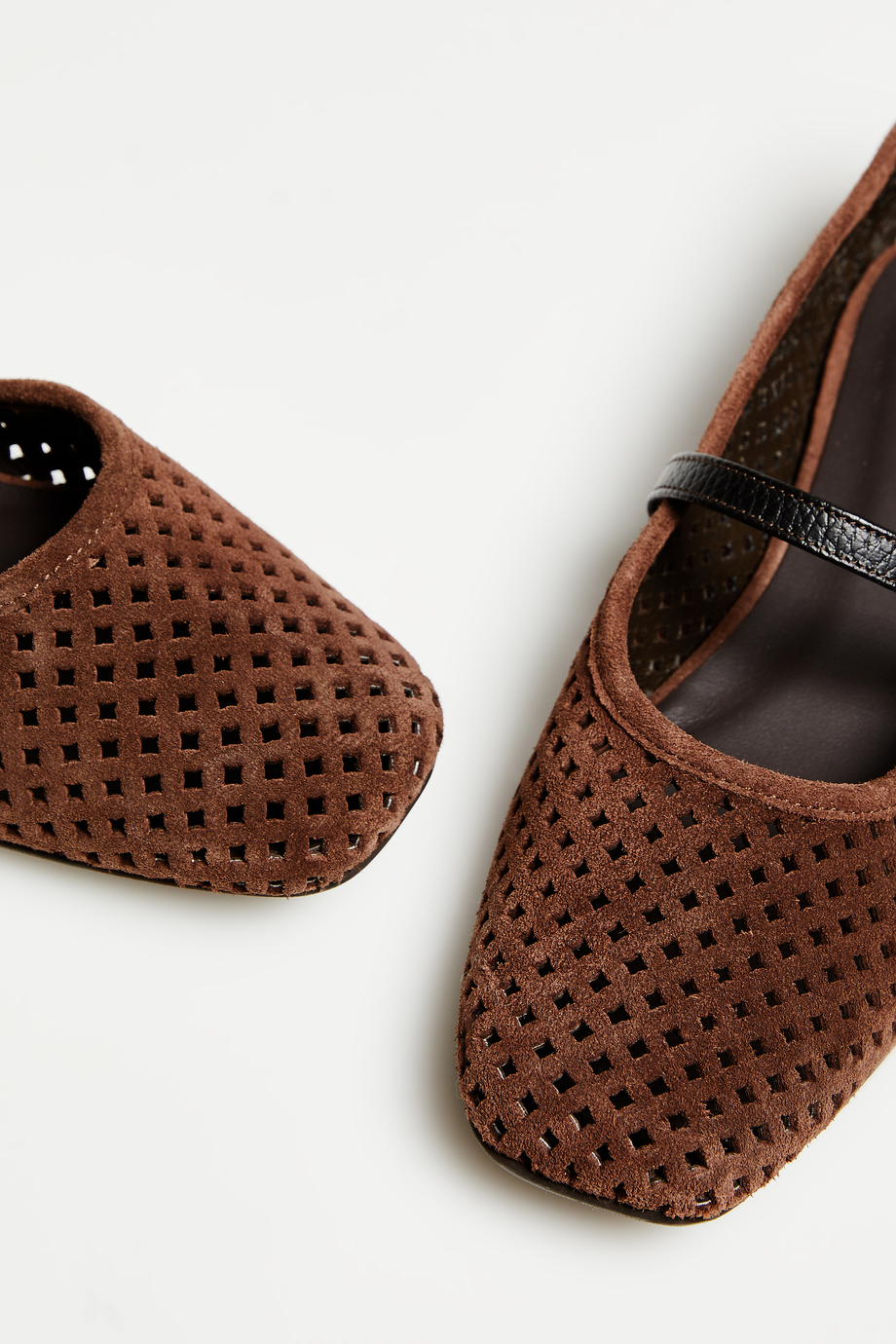Hnědé baleríny z přírodní kůže. Velmi měkká perforovaná hovězí kůže. Zapínání. Ručně šité v polské manufaktuře.
