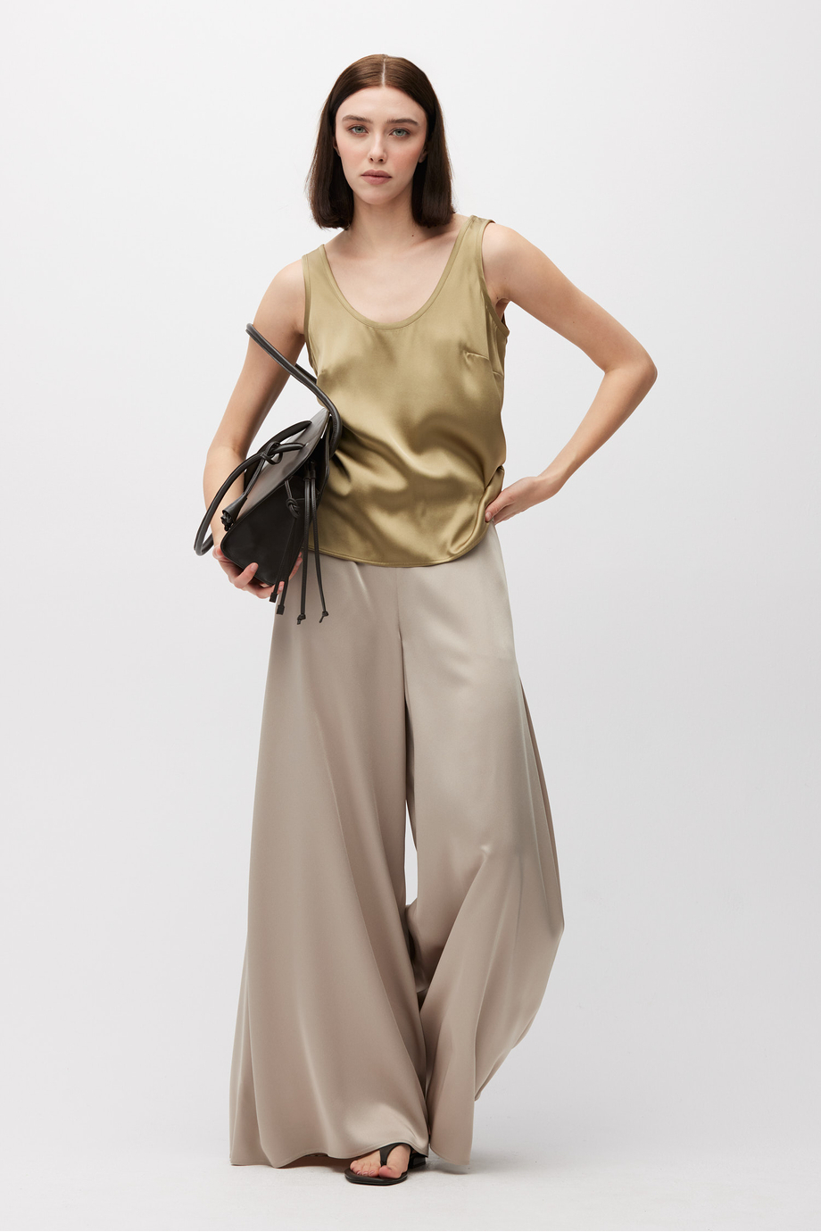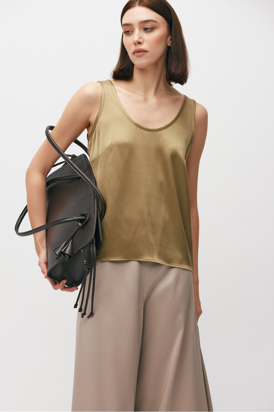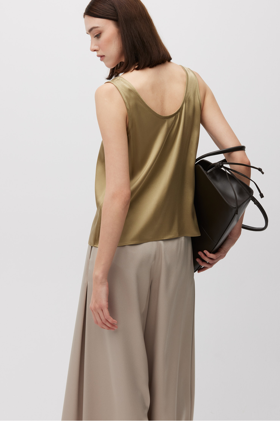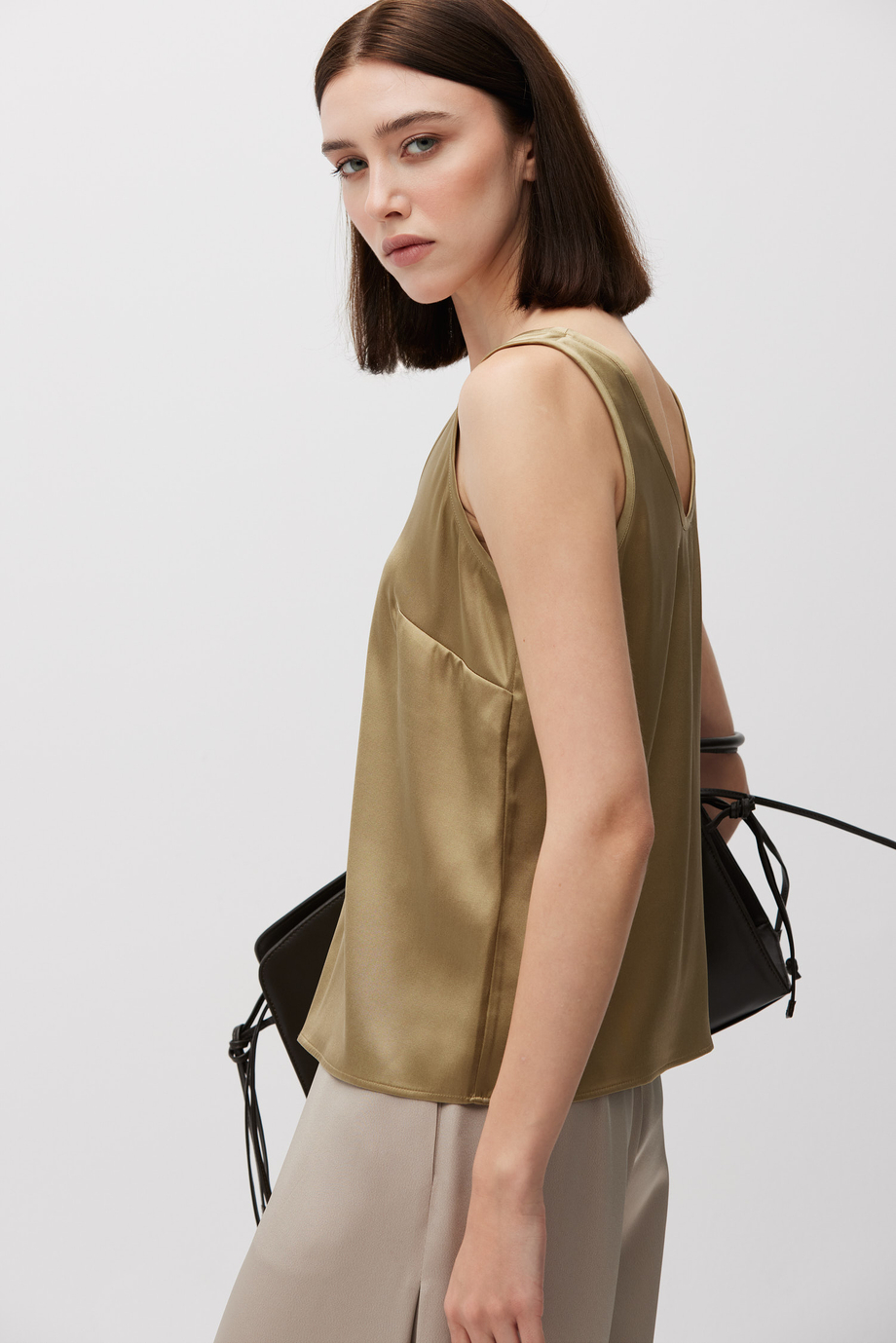 Zelený top z hutného hedvábí. Široká ramínka, kulatý výstřih, volný střih.