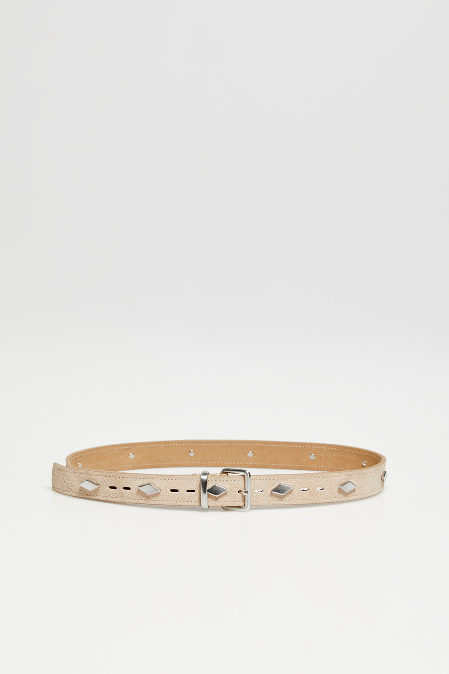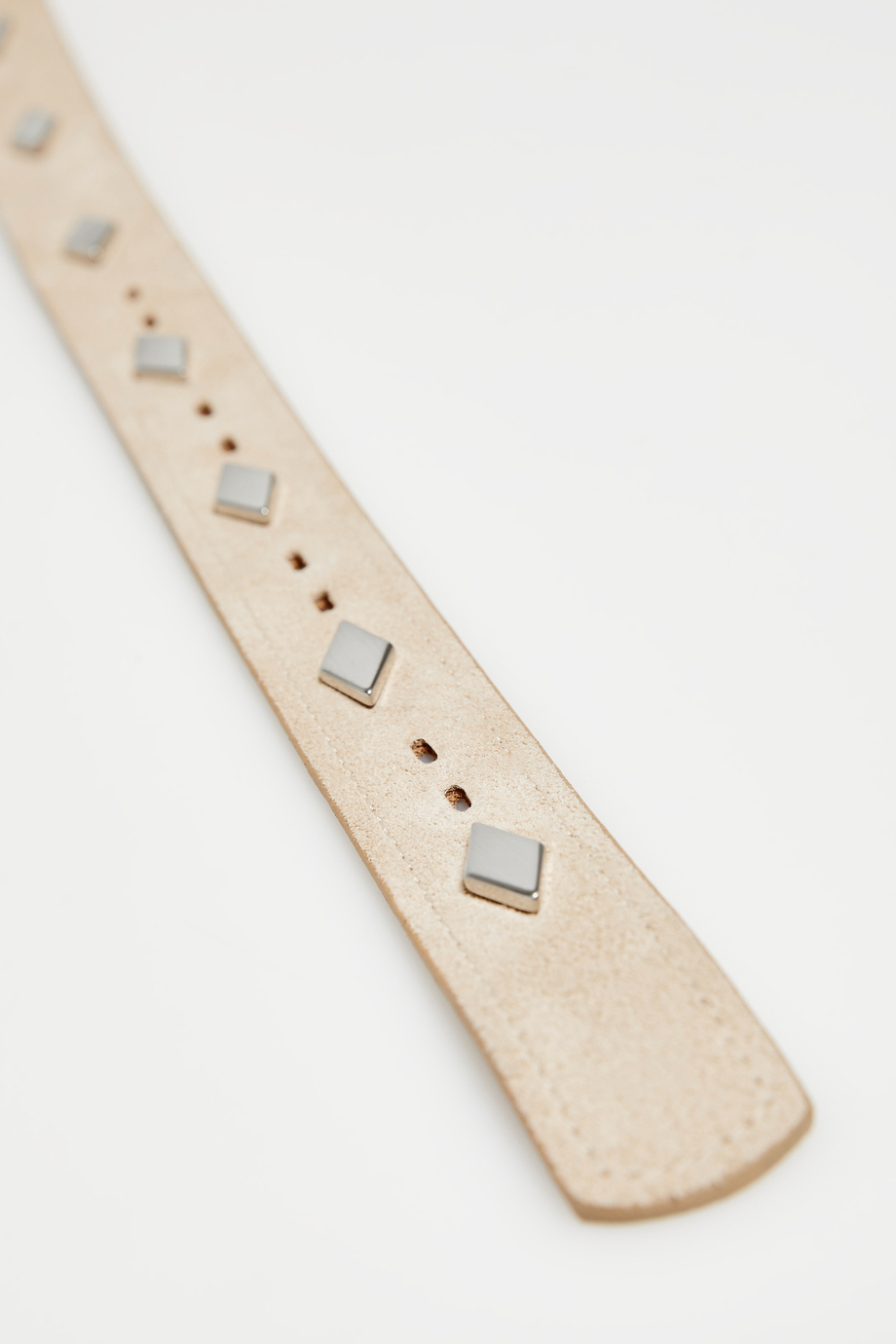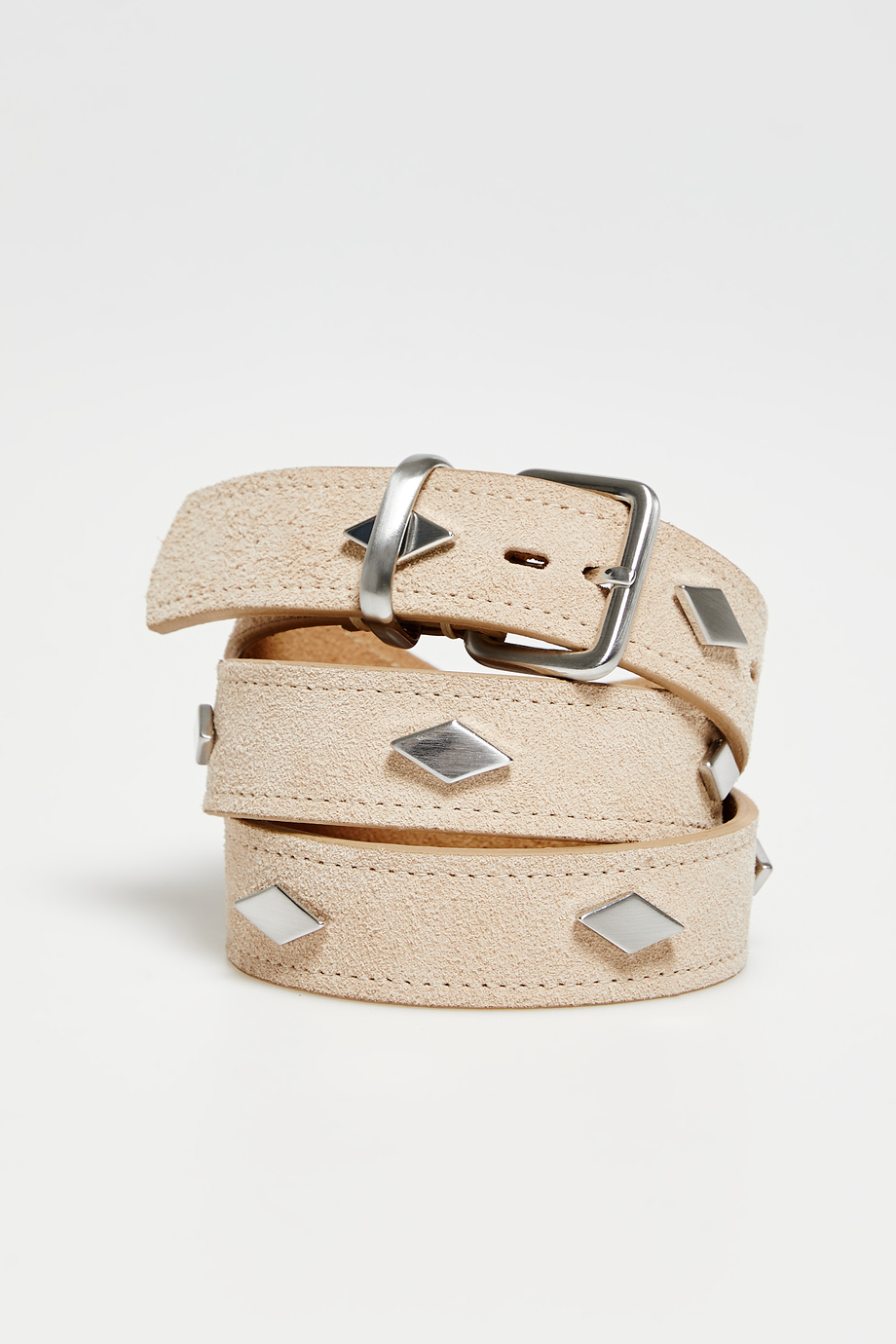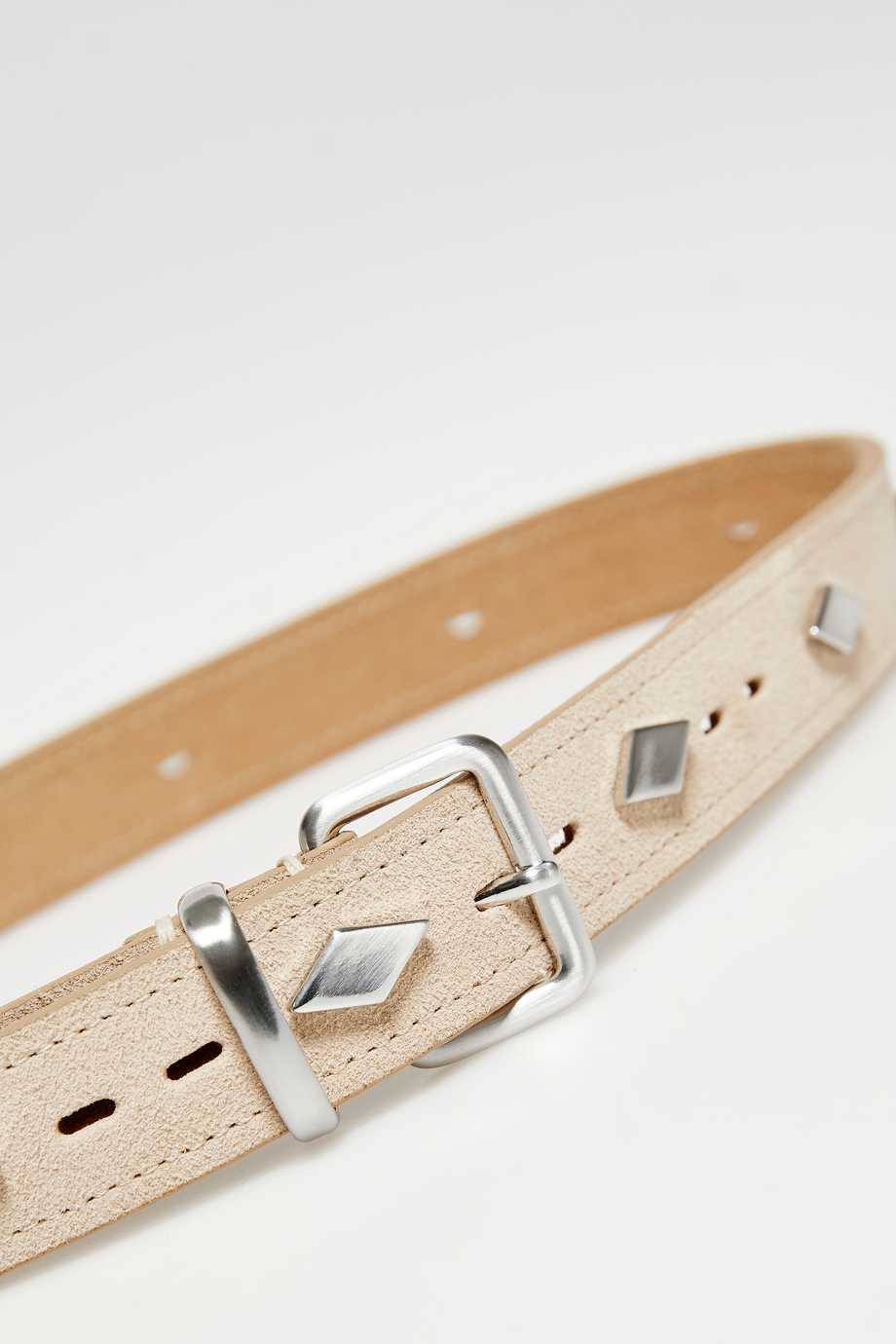 Béžový pásek ze semišové kůže. Zapínání na kovovou přezku. Ozdobné cvoky ve stříbrné barvě. Ručně šitý v portugalské manufaktuře.